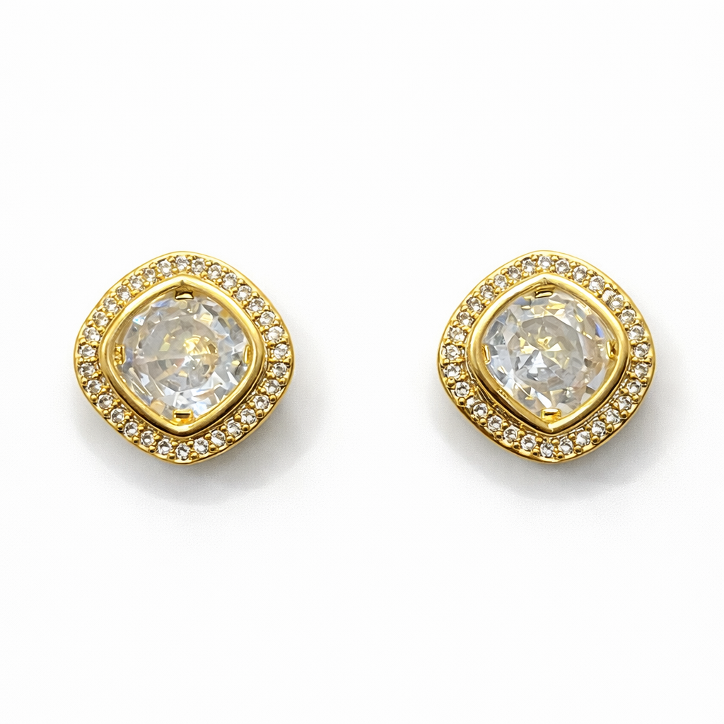 Classic square crystal stud earrings with a sparkling halo and gold finish—elegant, timeless, and perfect for everyday wear.