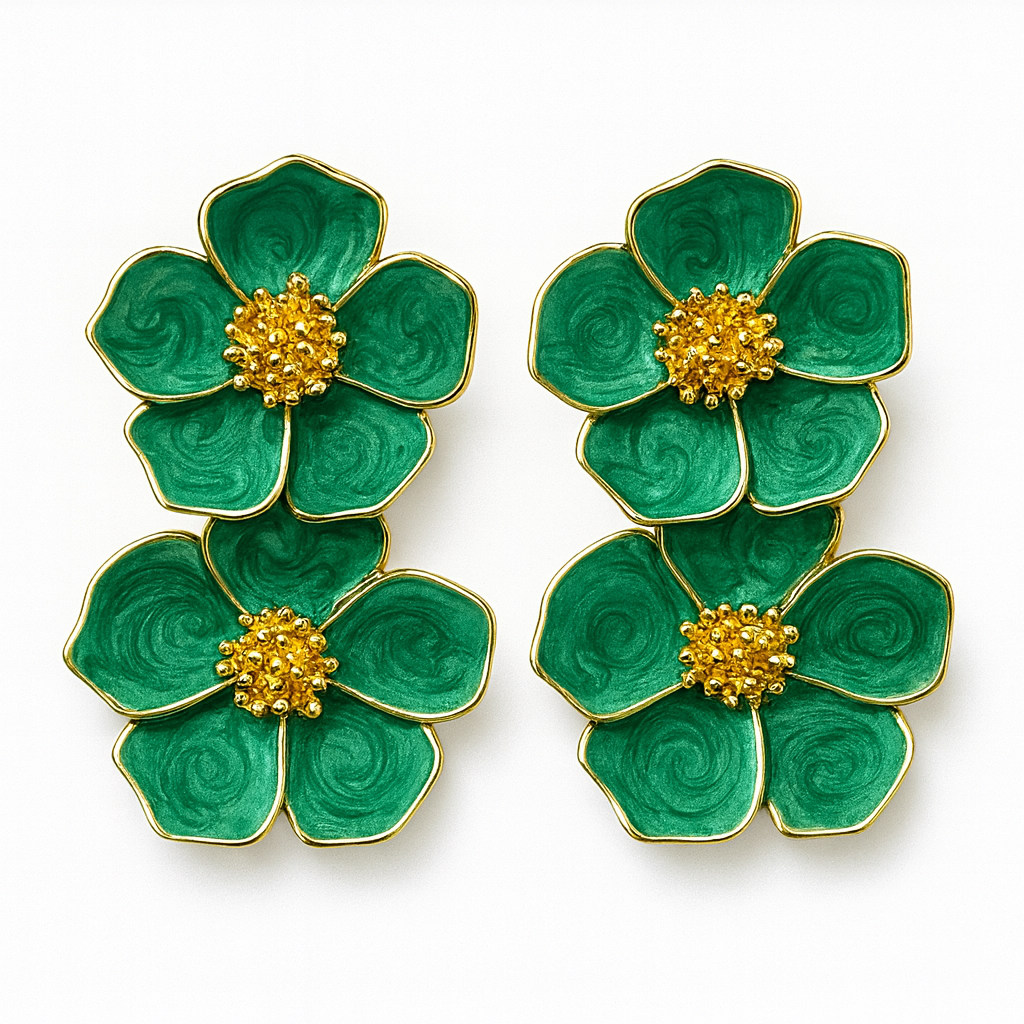 Step into vibrant elegance with our Emerald Bloom Drops, crafted to bring bold colour and timeless charm to your jewellery collection. These stunning earrings feature cascading double flowers in a rich emerald green enamel, beautifully framed with gold-toned detailing. Each petal is softly textured with swirling depth, while the golden beaded center adds a touch of sparkle and luxury.