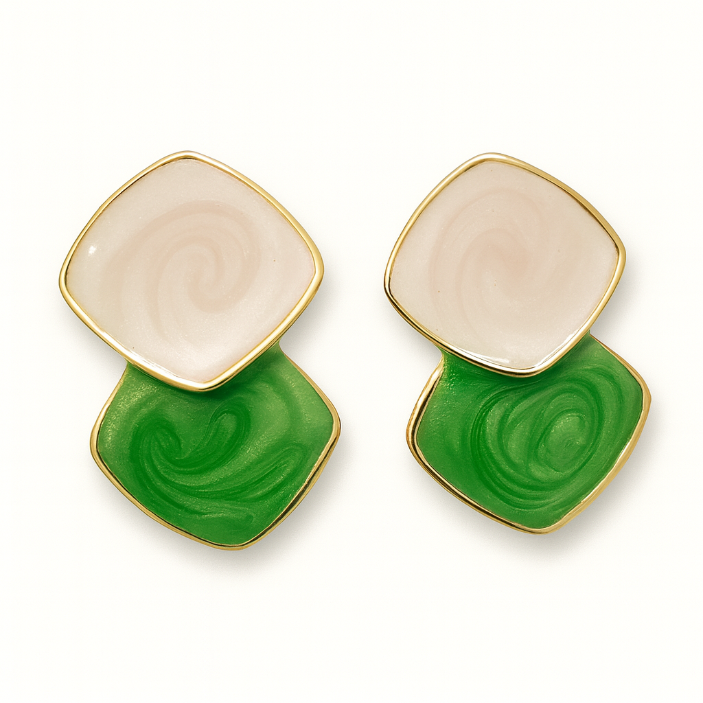 Introducing our Ivory Jade Fusion, a chic fusion of soft elegance and vibrant color play. These earrings feature two enamel-finished tiles—one in a creamy pearl-toned swirl and the other in a rich jade green. Each piece is edged with gold detailing, adding a luxurious touch to the modern geometric design.