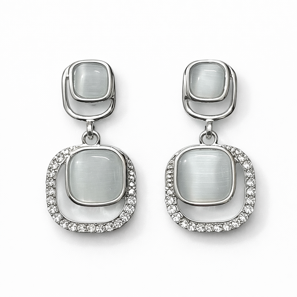 Elegant silver-tone square drop earrings with luminous stones and crystal detailing for a modern, refined look.