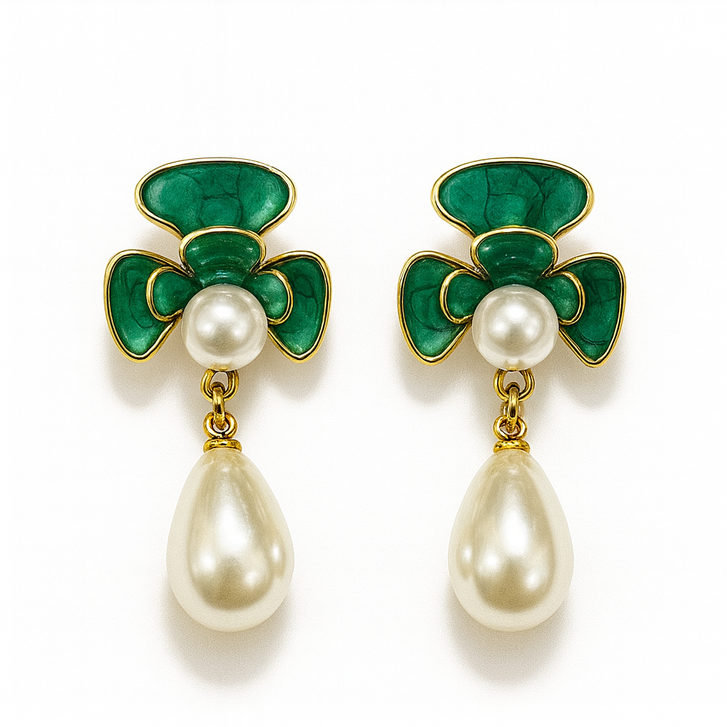 Introducing our Pearl Bow Drops, the perfect blend of playful charm and timeless elegance. These earrings feature a beautifully crafted emerald-green enamel bow accented with gold detailing, adding a bold pop of colour to your look. Below the bow rests a luminous round pearl, leading to a graceful teardrop pearl that creates luxurious movement and shine.