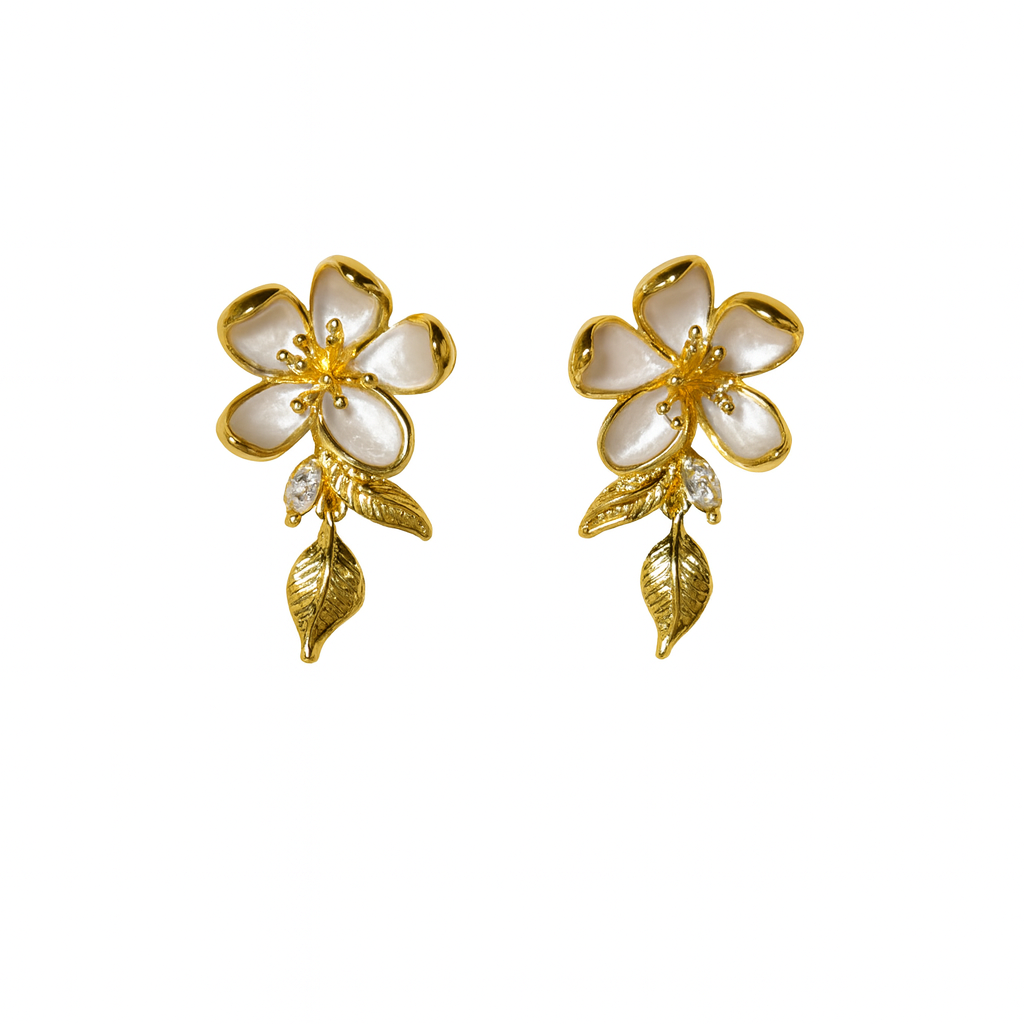 Elevate your elegance with the Pearl Petal Bloom Earrings, designed with glossy ivory petals outlined in gold for a soft, luxurious shine. Each earring features delicate gold leaves and a sparkling crystal accent, adding natural charm and timeless sophistication. Perfect for festive occasions, weddings, or elevating everyday outfits with a graceful floral touch.