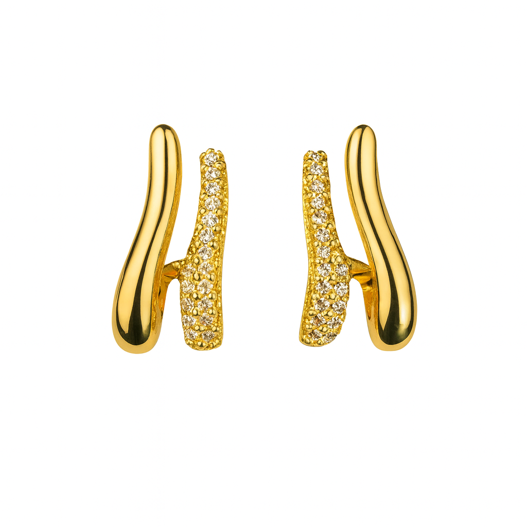 Experience effortless elegance with our Radiant Wave Duo, designed with a fluid, wave-inspired silhouette that beautifully frames the ear. These gold-toned earrings feature dual curved bands—one sleek and polished, the other encrusted with shimmering crystals—creating the perfect balance of sophistication and sparkle. Lightweight, modern, and versatile, they elevate both everyday looks and special-occasion outfits with their refined charm.