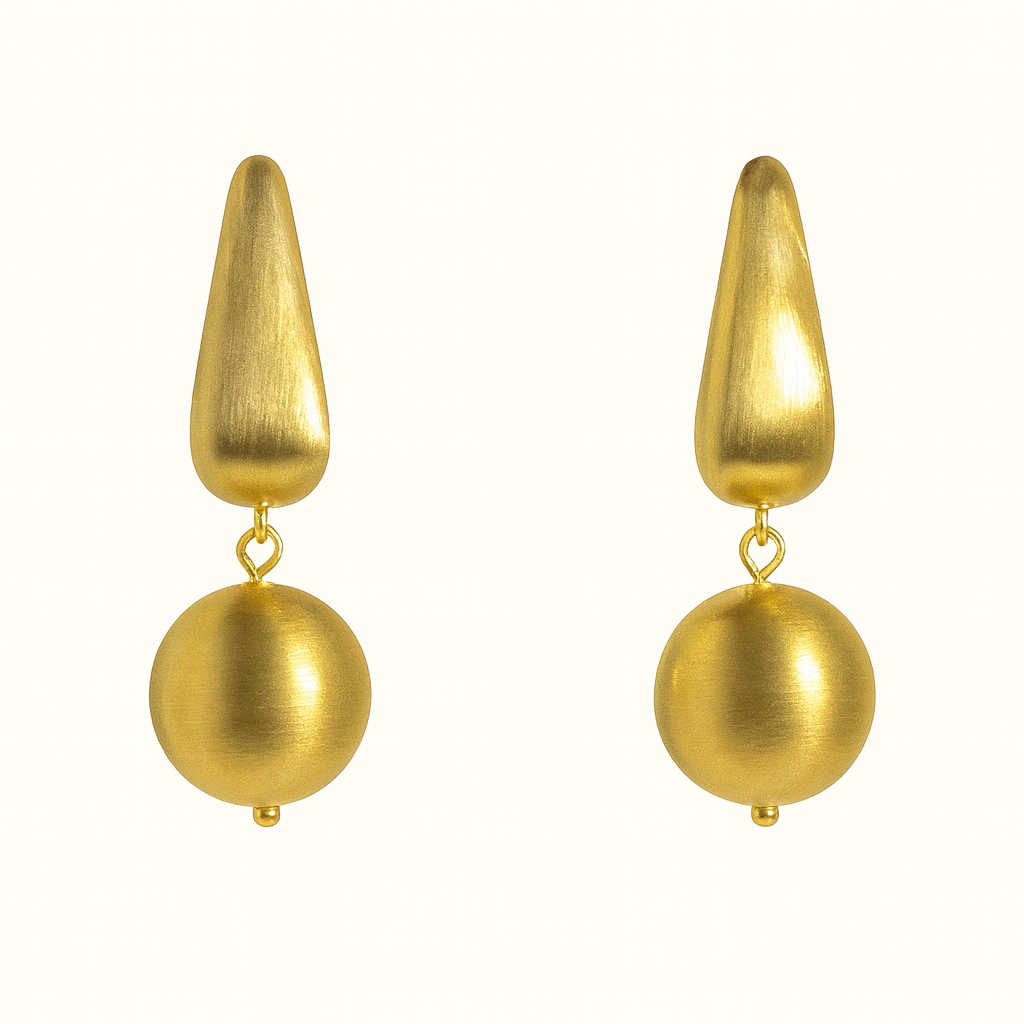 Elevate your everyday style with our Matte Gold Luxe Drop Earrings, crafted to bring a touch of refined sophistication to any look. Designed with a soft brushed-gold finish, these earrings feature a sculpted teardrop top paired with a graceful spherical drop that moves beautifully with every step.