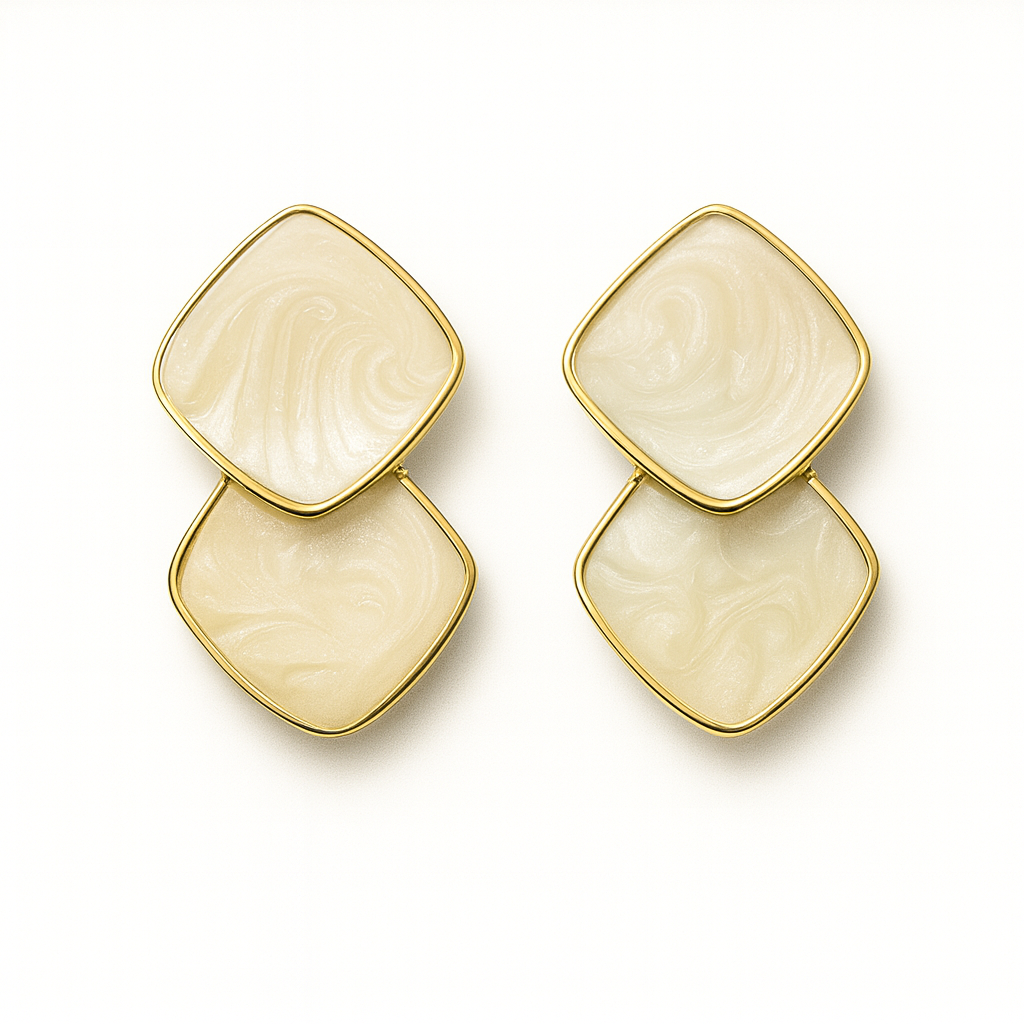 Introducing our Soft Pearl Squares, a graceful blend of soft elegance and modern minimalism. These earrings feature two stacked, enamel-finished tiles in a creamy ivory swirl pattern, framed delicately in gold. The satin-like enamel texture creates a gentle, luminous effect, making these earrings effortlessly chic and beautifully versatile.