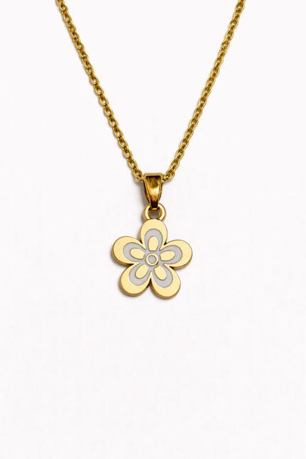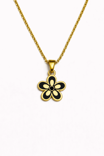 Gold floral swirl pendant with black enamel accents—bold, modern, and effortlessly elegant.