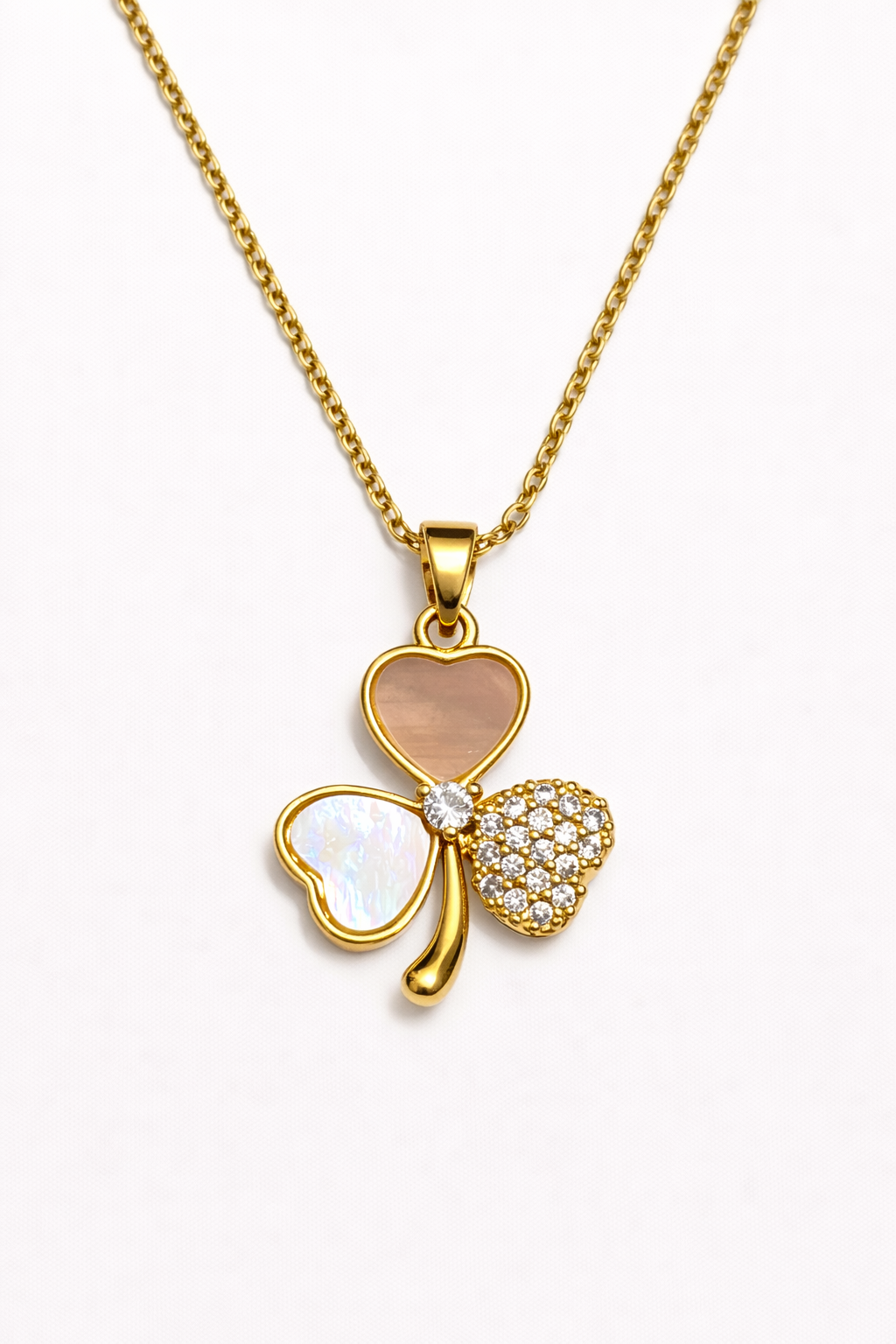 Elegant heart clover pendant necklace with pearl finish and crystal sparkle—symbolizing love, luck, and timeless beauty.